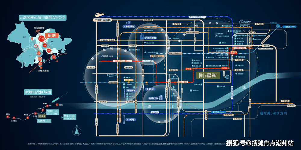 便捷交通项目毗邻13号线沙村站和白江站双地铁站,一站老黄埔,七站直达天河;在建13号二期横跨黄埔天河越秀荔湾和白云五大主城区,比肩3号线黄金动脉,开通后无须换乘,一轨直达珠江新城(花城广场北站),尽享主城繁华;项目位于新塘大道南侧,可快速接驳广园快速、京港澳高速和临江大道三大主干道畅达黄埔天河东莞深圳;一站新塘TOD,汇聚10条轨道:5条地铁【13号线(一期已建成、二期建设中)、16号线号线号线条城际轻轨【穗莞深*、新白广*】连接大湾区城市群、3条高铁【广深铁路(已建成)、广汕铁路(建设中)、京九铁路*】连通省际,互通2大国际机场,日均人流量将达80万。