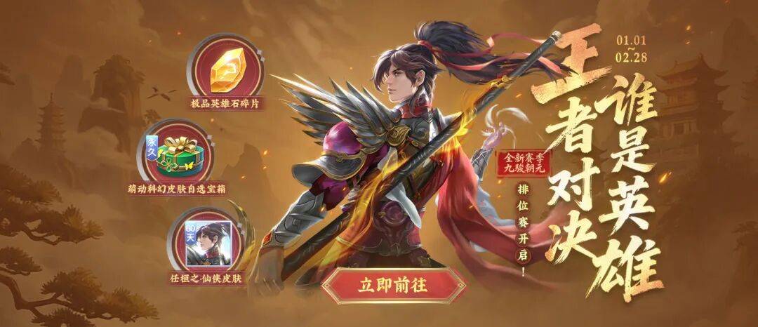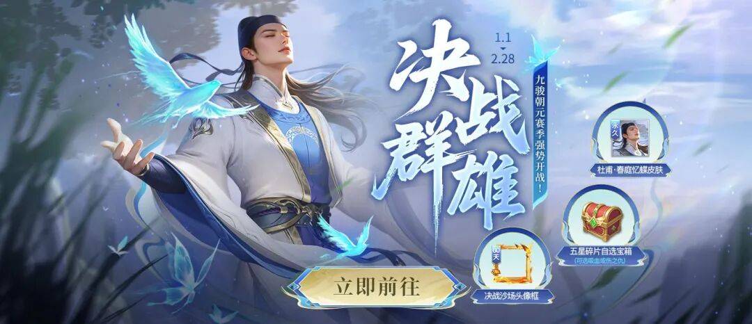3V3刺激对局,英雄策略智斗!1月1日起,“决战群雄”九骏朝元赛季强势开战,杜甫新皮肤首发亮相,还有各种游戏道具、限定装扮可得!