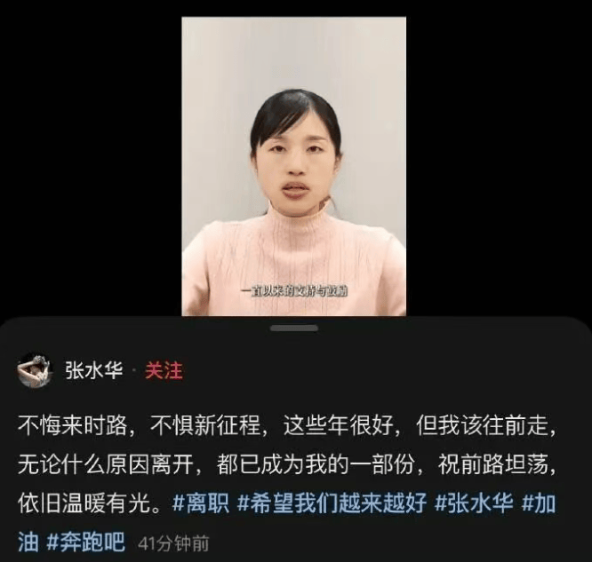 1月2日,张水华宣布辞职:不悔来时路,不惧新征程,这些年很好,但我该往前走,无论什么原因离开,都已成为我的一部分,祝前路坦荡,依旧温暖有光。