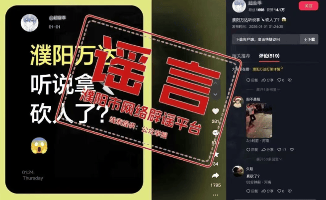 1月1日,某平台账号“超*乖”发布信息称“濮阳万达拿刀砍人了”,经濮阳市网信办核实查证,网传事件实为现场文艺表演活动,未出现持刀伤人事件。“拿刀砍人”相关信息为不实信息。